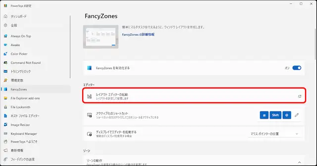 左側のFancyZonesをクリックすると、設定画面が開きます。