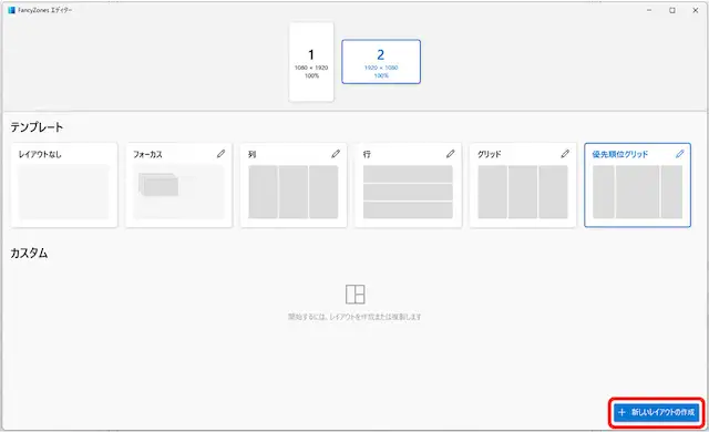 ①Fancy Zonesエディターのウィンドウにある自分で作成したレイアウトの鉛筆マークをクリックする。